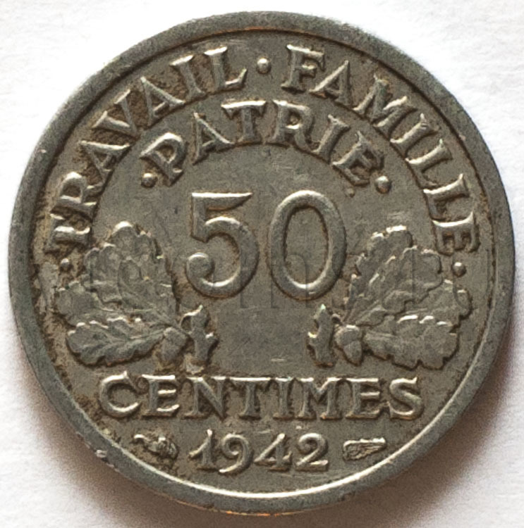 Франция 50 сантим 1942-1944 Режим Виши, франциска (VF-XF)