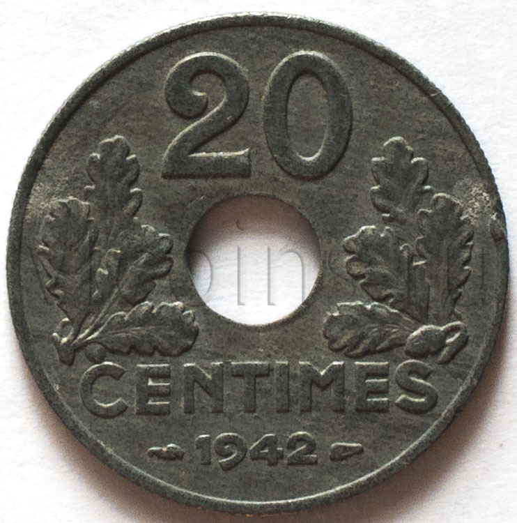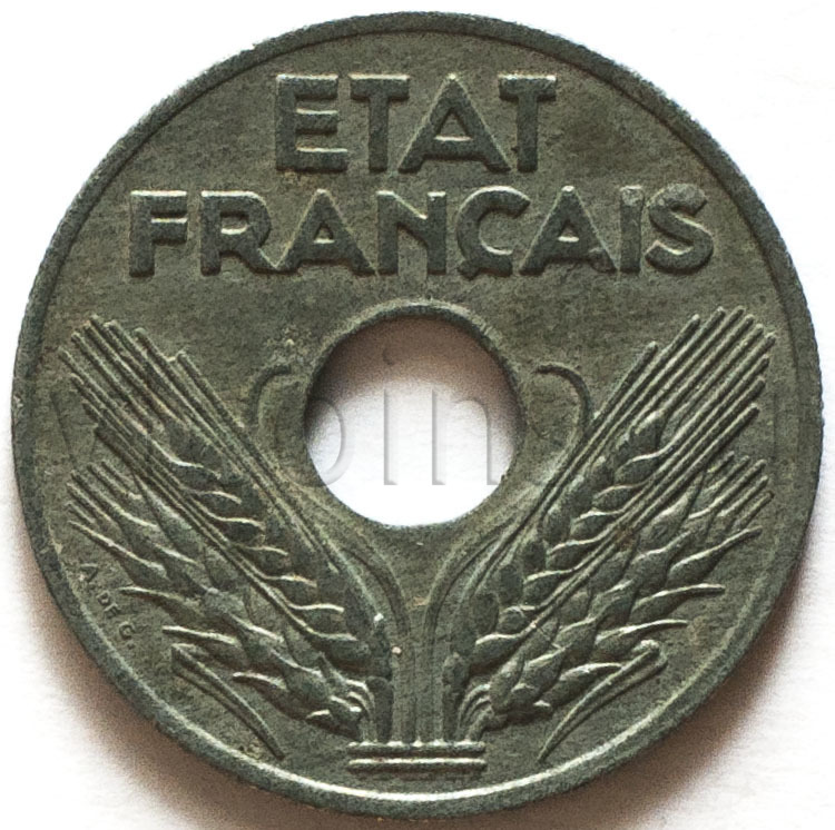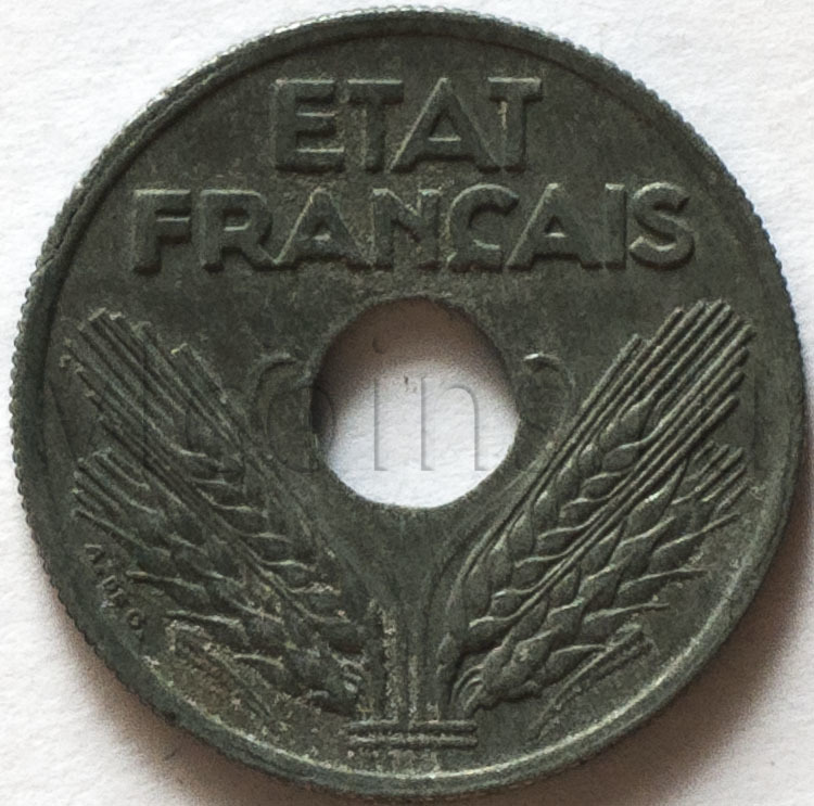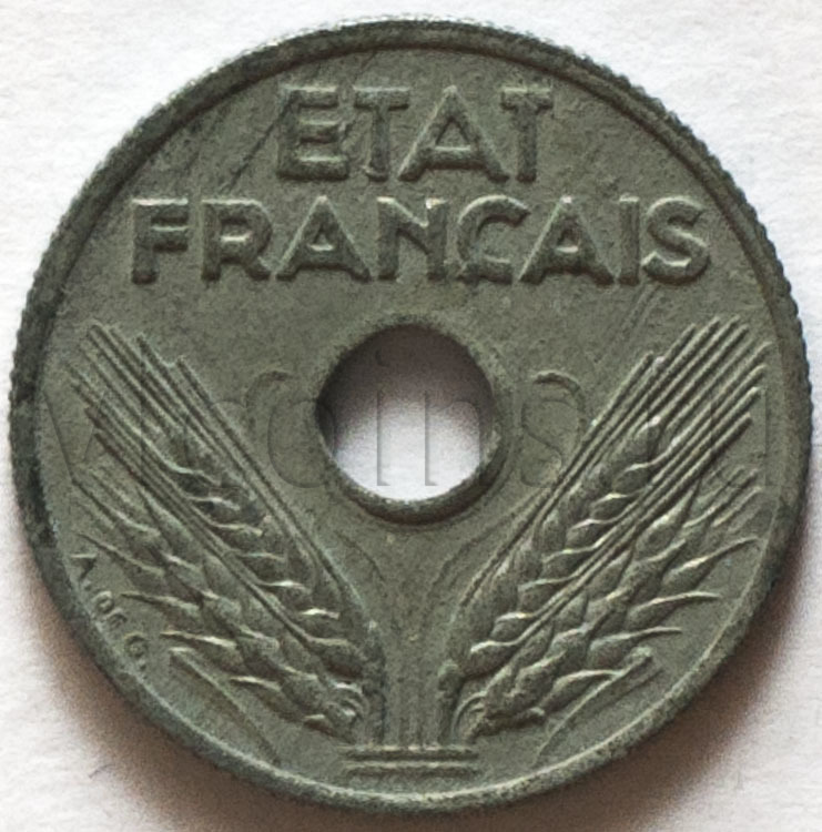 Франция 20 сантим 1941-1944 Режим Виши, колосья пшеницы. Цинк (VF-XF)
