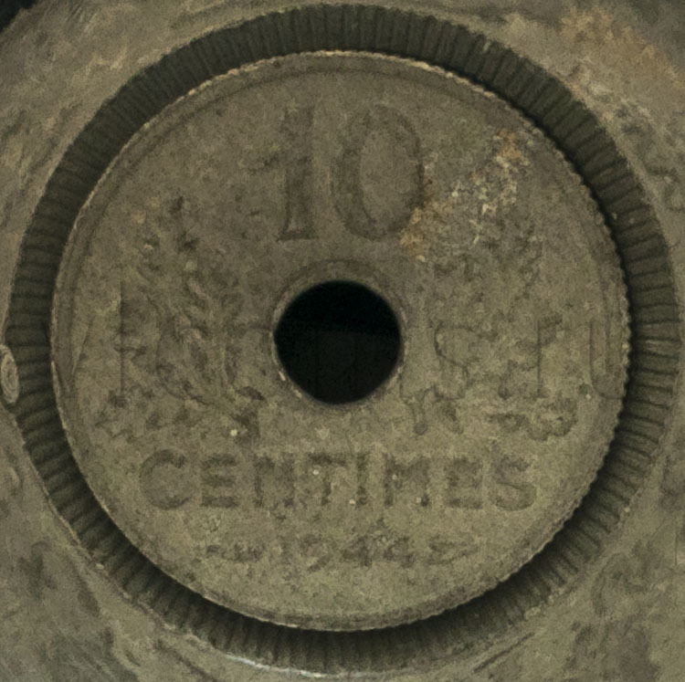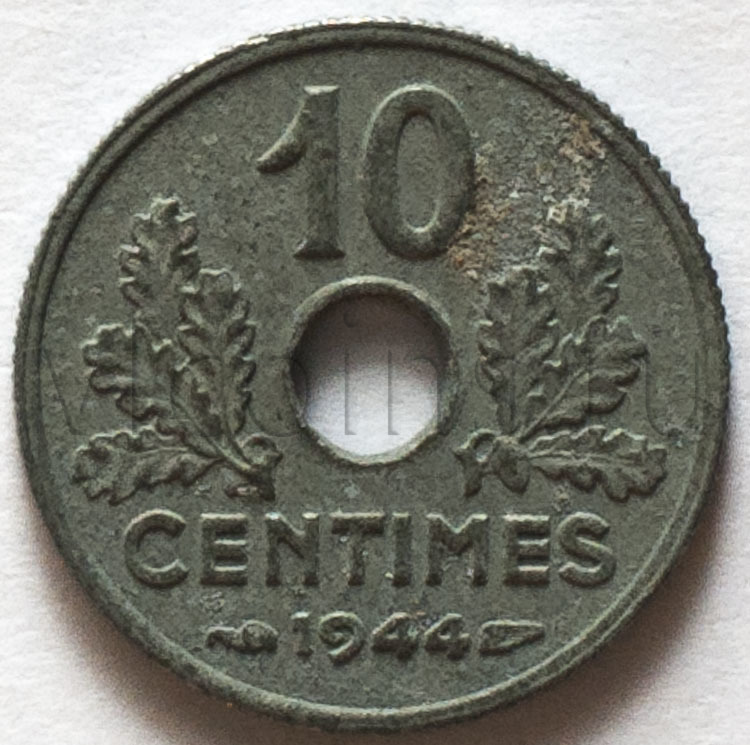 Франция 10 сантим 1943-1944 Режим Виши, цинк km903 (VF-XF)